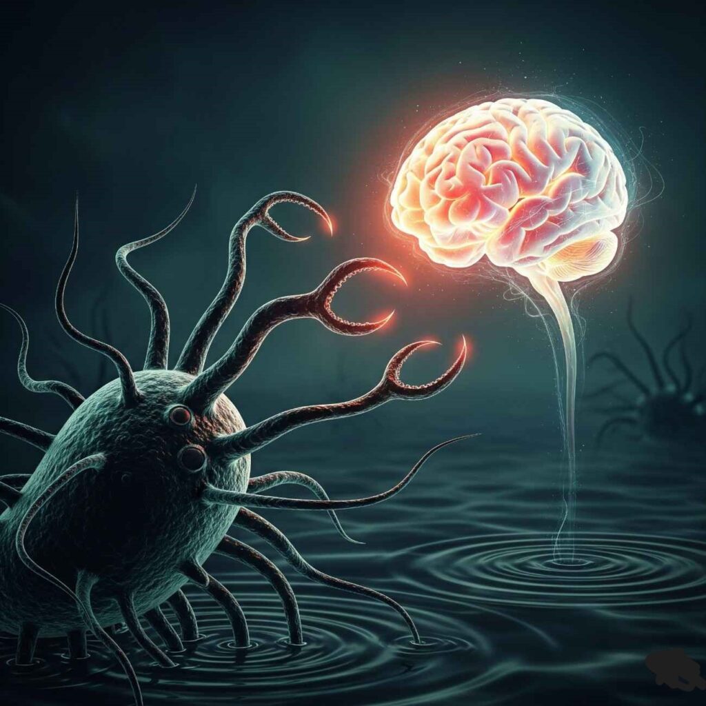 Amoebic meningoencephalitis is caused by a free-living amoeba, most commonly Naegleria fowleri, sometimes referred to as the “brain-eating amoeba.” The organism typically infects people when contaminated water enters the body through the nose, after which it migrates to the brain. The infection is extremely rare but highly fatal, with mortality rates exceeding 90 percent worldwide.